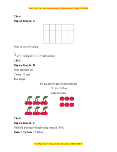 số ô vuông là: 15 : 3 = 5 (ô vuông) Câu 5. Đáp án đúng là: D Hình bên dưới có: Cherry: 12 quả Táo: 6 quả
