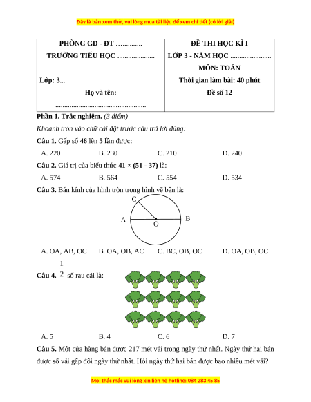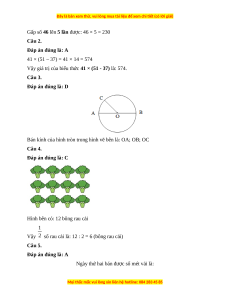 Vậy số rau cải là: 12 : 2 = 6 (bông rau cải) Câu 5. Đáp án đúng là: A