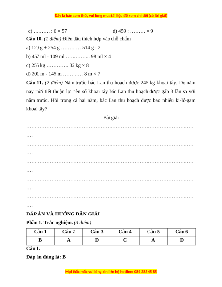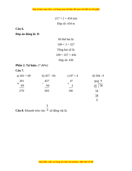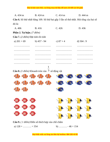 Câu 7. (2 điểm) Đặt tính rồi tính a) 201 + 69 b) 457 - 94 c) 87 × 4 d) 504 : 9 ………………. ………………. ………………. ………………. ………………. ………………. ………………. ………………. ………………. ………………. ………………. ………………. ………………. ………………. ………………. ………………. ………………. ………………. ………………. ……………….
