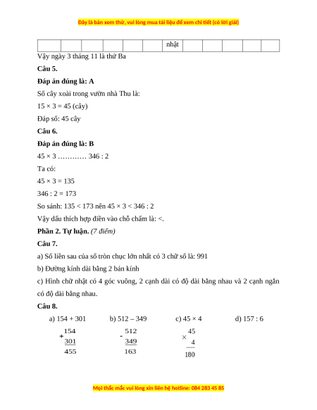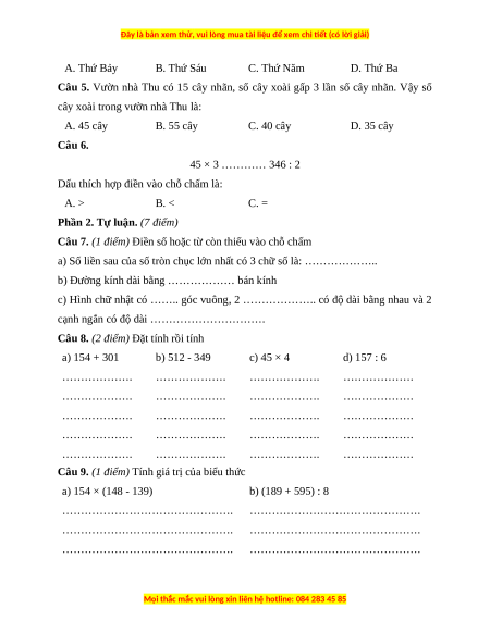 Câu 8. (2 điểm) Đặt tính rồi tính a) 154 + 301 b) 512 - 349 c) 45 × 4 d) 157 : 6 ………………. ………………. ………………. ………………. ………………. ………………. ………………. ………………. ………………. ………………. ………………. ………………. ………………. ………………. ………………. ………………. ………………. ………………. ………………. ……………….