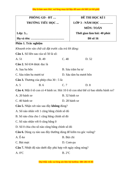 Câu 3. Thương của phép chia 30 : 5 là: A. 5 B. 6 C. 7 D. 8