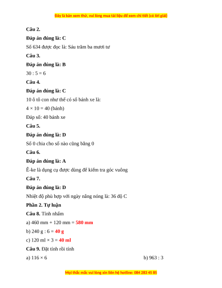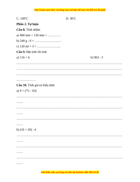 C. 100oC D. 36oC Phần 2. Tự luận Câu 8. Tính nhẩm