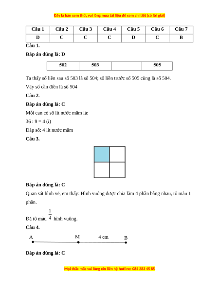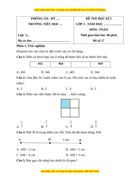 Câu 2. Chia đều 36 l nước mắm vào 9 can. Hỏi mỗi can có bao nhiêu lít nước mắm? A. 2 B. 3 C. 4 D. 5