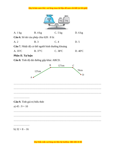 Câu 7. Nhiệt độ cơ thể người bình thường khoảng A. 35oC B. 37oC C. 38oC D. 40oC Phần II. Tự luận