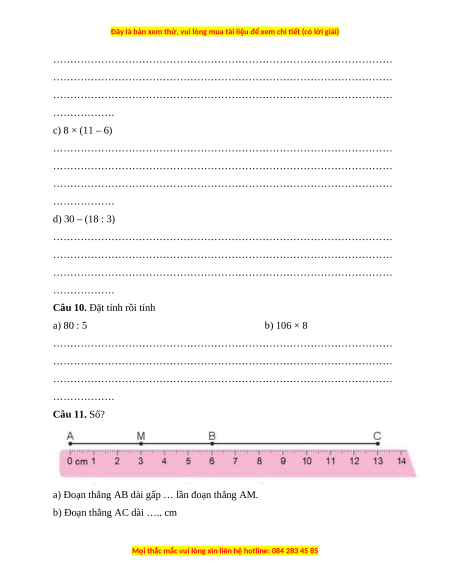 Câu 10. Đặt tính rồi tính a) 80 : 5 b) 106 × 8