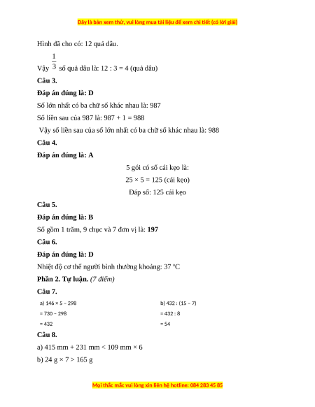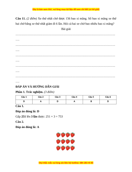 Vậy số quả dâu là: 12 : 3 = 4 (quả dâu) Câu 3. Đáp án đúng là: D