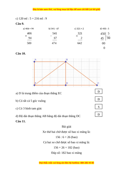 Câu 11. (2 điểm) Xe thứ nhất chở được 156 bao xi măng. Số bao xi măng xe thứ