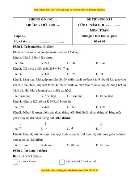 - Tailieugiaovien.com.vn giới thiệu bộ 20 đề thi cuối kì 1 có đầy đủ ma trận Toán 3 Kết nối tri thức mới nhất nhằm giúp Giáo viên có thêm tài liệu tham khảo ra đề thi Toán lớp 3.