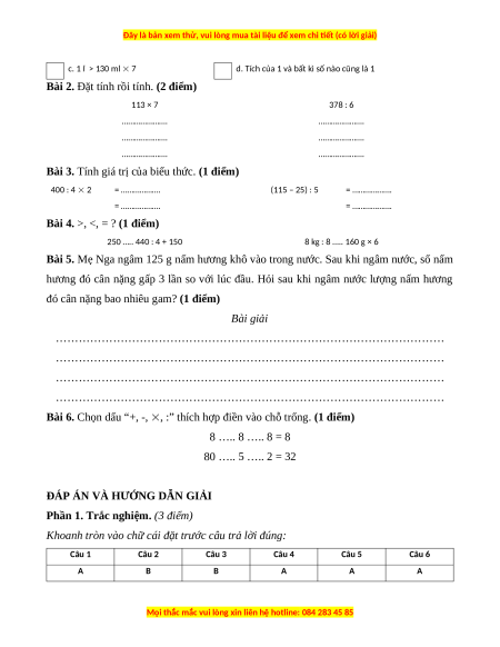 Vậy Mai cần mua thêm 7 cái hộp. Câu 4. Đáp án đúng là: A