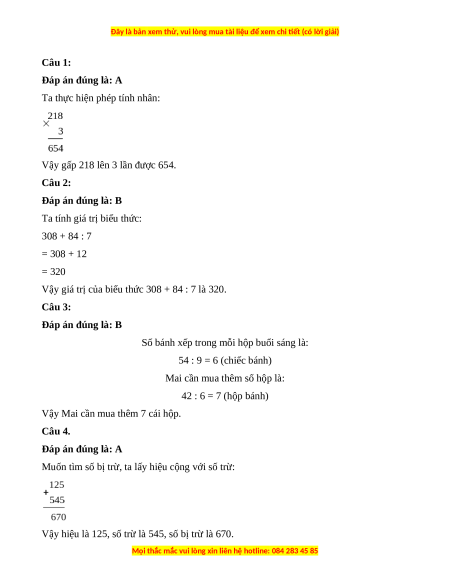 Vậy gấp 218 lên 3 lần được 654. Câu 2: Đáp án đúng là: B