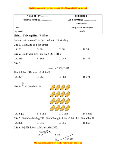 LỚP 3 - NĂM HỌC ....................... MÔN: TOÁN Lớp: 3...