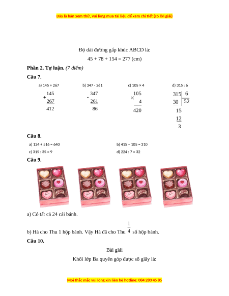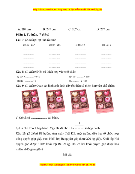 Câu 7. (2 điểm) Đặt tính rồi tính a) 145 + 267 b) 347 - 261 c) 105 × 4 d) 315 : 6 ………………. ………………. ………………. ………………. ………………. ………………. ………………. ………………. ………………. ………………. ………………. ………………. ………………. ………………. ………………. ………………. ………………. ………………. ………………. ……………….