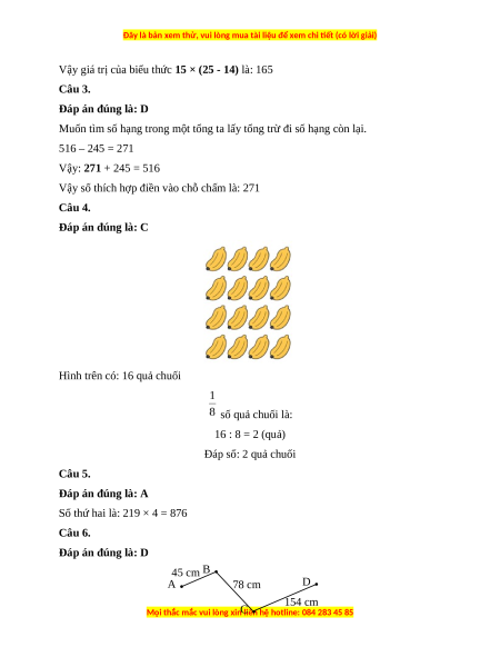 Số thứ hai là: 219 × 4 = 876 Câu 6. Đáp án đúng là: D 45 cm B . A . 78 cm D . 154 cm