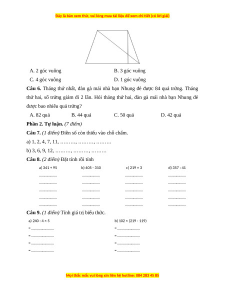 Câu 9. (1 điểm) Tính giá trị biểu thức. a) 240 : 4 × 5 b) 102 × (219 - 119) = …………………… = …………………… = …………………… = …………………… = …………………… = …………………… = …………………… = ……………………