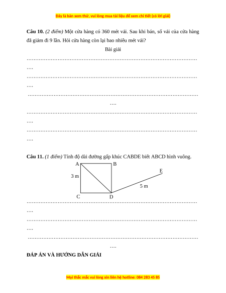 Câu 10. (2 điểm) Một cửa hàng có 360 mét vải. Sau khi bán, số vải của cửa hàng