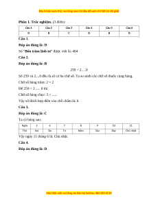 Vậy số thích hợp điền vào chỗ chấm là: 6 Câu 3. Đáp án đúng là: C Ta có bảng sau: Ngày 5 6 7 8 9 10 11 Thứ Hai Ba Tư Năm Sáu Bảy Chủ nhật