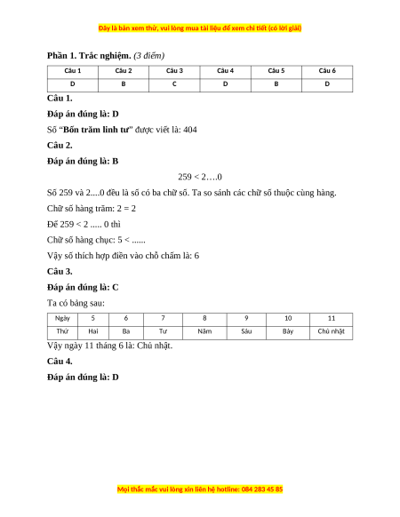 Số “Bốn trăm linh tư” được viết là: 404 Câu 2. Đáp án đúng là: B 259 < 2….0