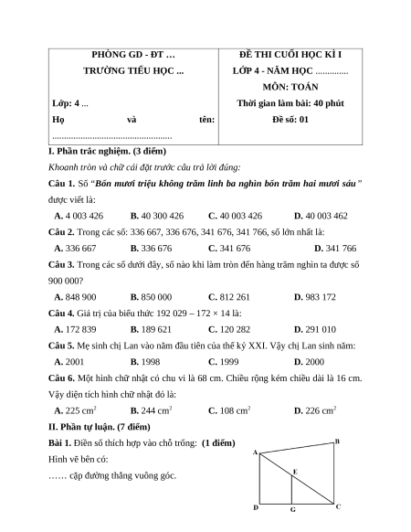 LỚP 4 - NĂM HỌC .............. MÔN: TOÁN Lớp: 4 ...