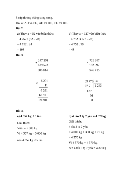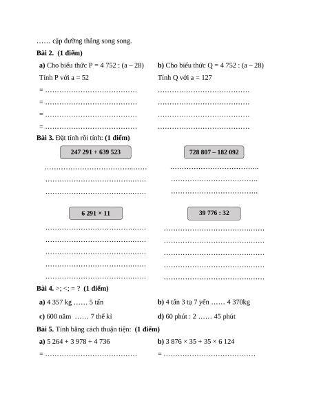 b) Cho biểu thức Q = 4 752 : (a – 28) Tính P với a = 52 Tính Q với a = 127