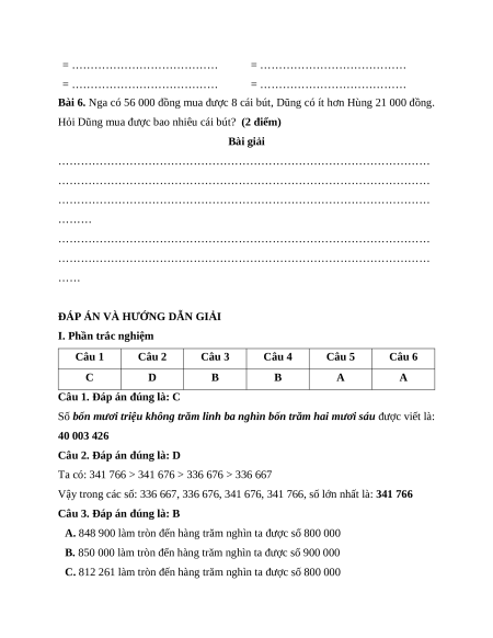 Câu 2. Trong các số: 336 667, 336 676, 341 676, 341 766, số lớn nhất là: A. 336 667 B. 336 676 C. 341 676 D. 341 766