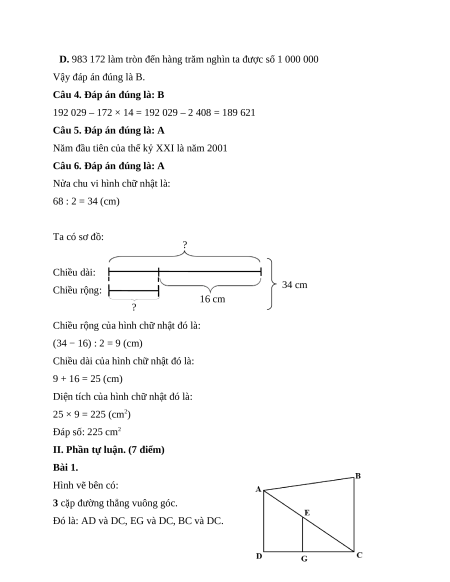 Câu 6. Một hình chữ nhật có chu vi là 68 cm. Chiều rộng kém chiều dài là 16 cm.