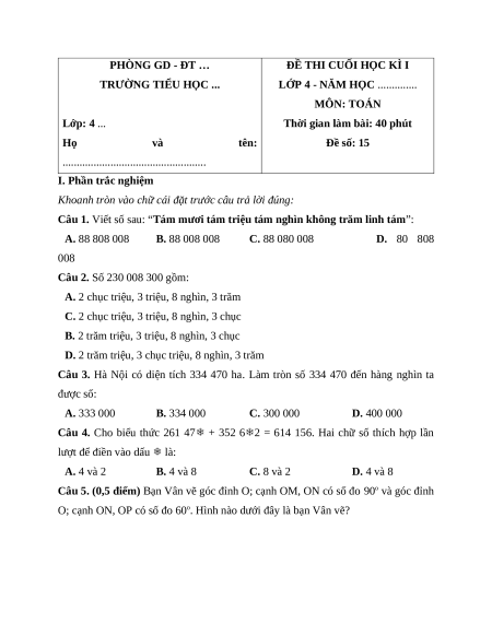 Đề thi cuối kì 1 Toán lớp 4 Cánh diều - Đề 15