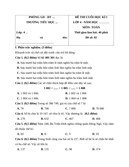 LỚP 4 - NĂM HỌC .............. MÔN: TOÁN Lớp: 4 ...