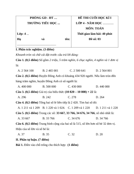 Thời gian làm bài: 40 phút Họ và tên: Đề số: 03