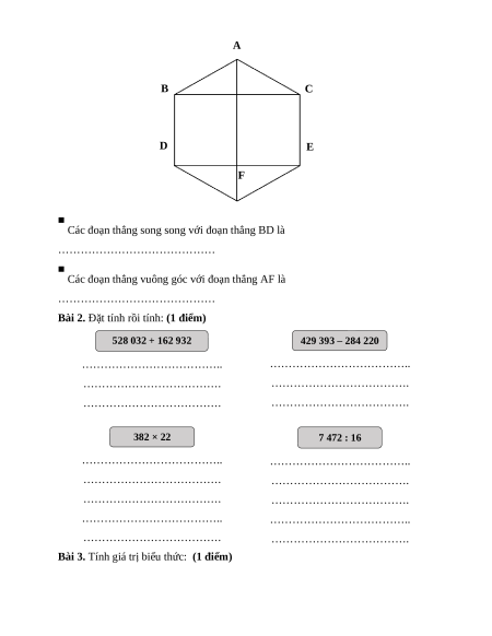 Bài 2. Đặt tính rồi tính: (1 điểm) 528 032 + 162 932 429 393 – 284 220