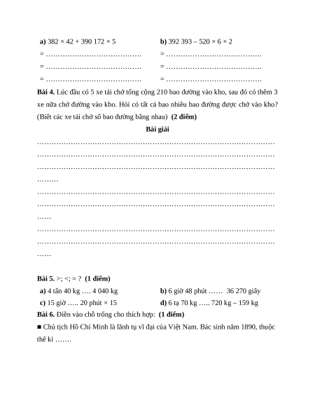 Bài 4. Lúc đầu có 5 xe tải chở tổng cộng 210 bao đường vào kho, sau đó có thêm 3