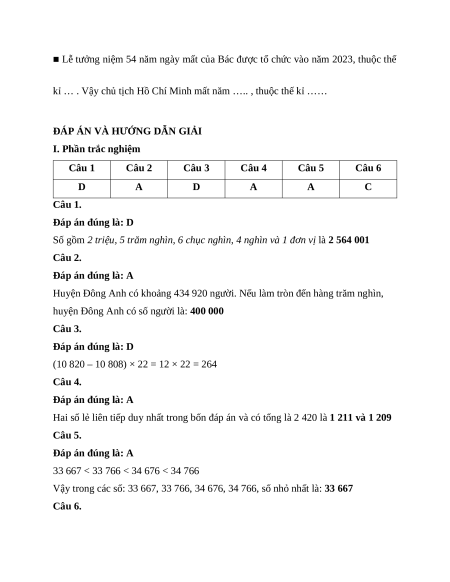 huyện Đông Anh có số người là: 400 000 Câu 3. Đáp án đúng là: D
