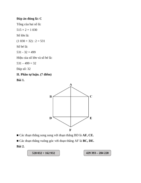 Câu 6. (0,5 điểm) Trung bình cộng của hai số là 515, số lớn hơn số bé 32 đơn vị.