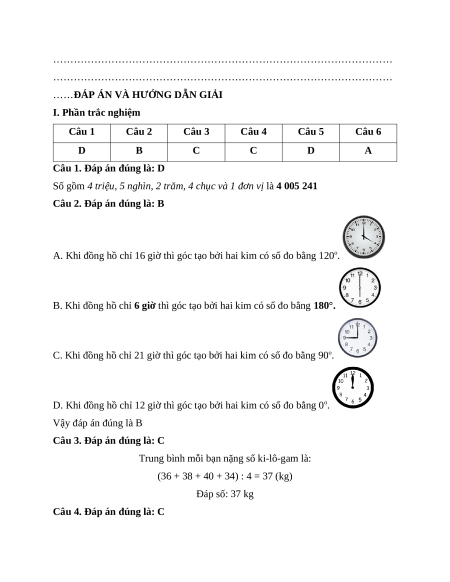 Câu 2. Khi đồng hồ chỉ mấy giờ thì góc tạo bởi hai kim có số đo bằng 180°. A. 16 giờ B. 6 giờ C. 21 giờ D. 12 giờ