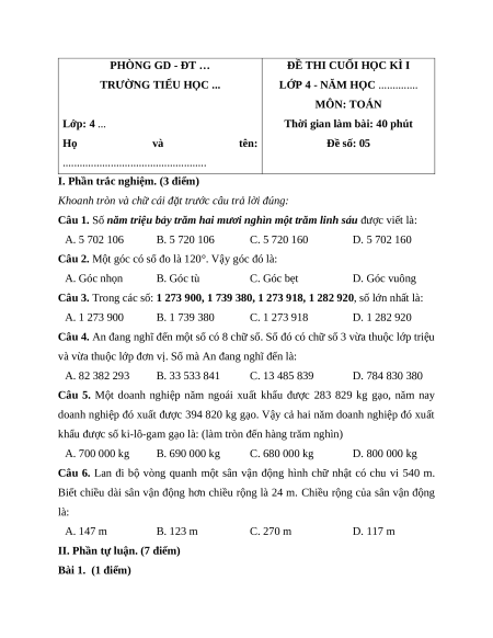Đề thi cuối kì 1 Toán lớp 4 Cánh diều - Đề 5