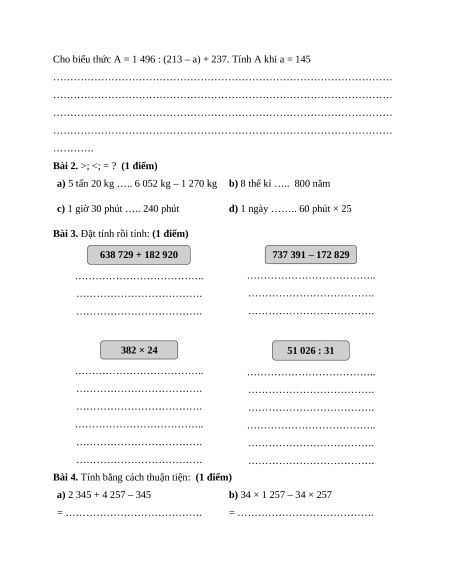 Bài 4. Tính bằng cách thuận tiện: (1 điểm)