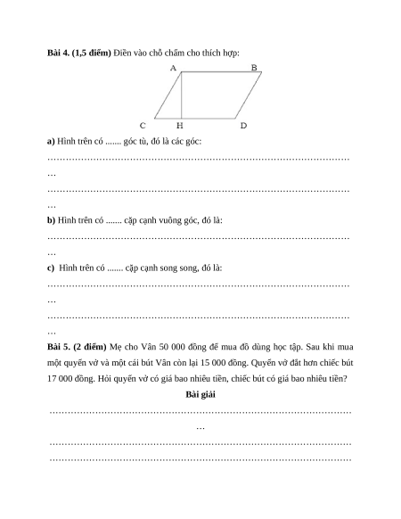 Bài 5. (2 điểm) Mẹ cho Vân 50 000 đồng để mua đồ dùng học tập. Sau khi mua
