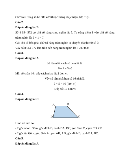 Câu 2. (0,5 điểm) Số 8 654 572 làm tròn đến hàng trăm nghìn là: A. 8 754 572 B. 8 700 000 C. 8 654 572 D. 8 600 000