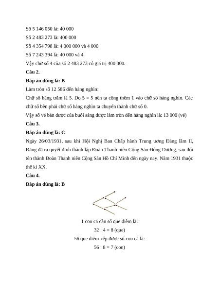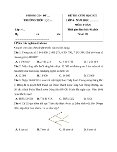 Câu 1. Trong các số 5 146 050, 2 483 273, 4 354 798, 7 243 394. Chữ số 4 của số nào có giá trị 400 000? A. 5 146 050 B. 2 483 273 C. 4 354 798 D. 7 243 394