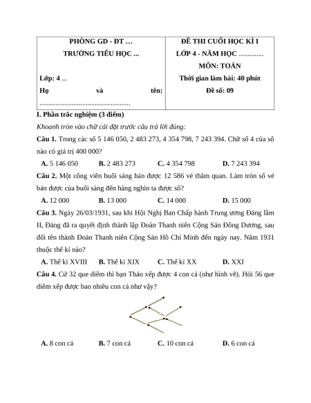 Đề thi cuối kì 1 Toán lớp 4 Cánh diều - Đề 9