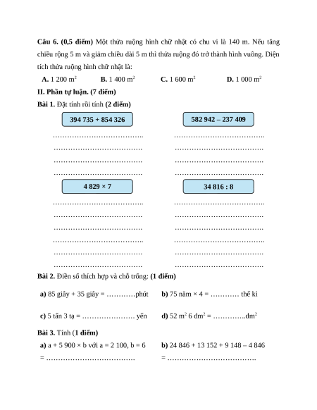 Bài 1. Đặt tính rồi tính (2 điểm) 394 735 + 854 326 582 942 – 237 409