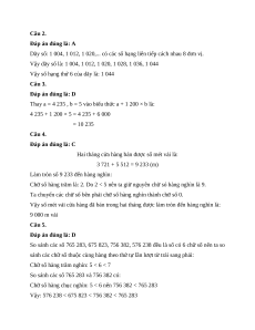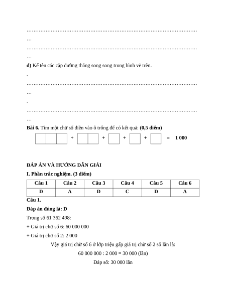 I. Phần trắc nghiệm. (3 điểm) Câu 1 Câu 2 Câu 3 Câu 4 Câu 5 Câu 6 D A D C D A Câu 1. Đáp án đúng là: D Trong số 61 362 498: