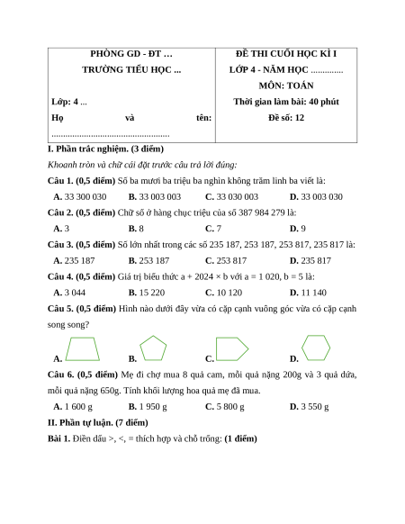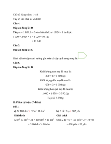 Câu 1. (0,5 điểm) Số ba mươi ba triệu ba nghìn không trăm linh ba viết là: A. 33 300 030 B. 33 003 003 C. 33 030 003 D. 33 003 030