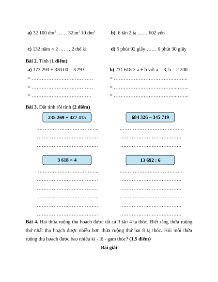 Bài 3. Đặt tính rồi tính (2 điểm) 235 269 + 427 415 684 326 – 345 719