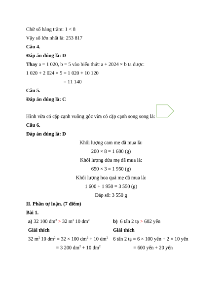 Câu 4. (0,5 điểm) Giá trị biểu thức a + 2024 × b với a = 1 020, b = 5 là: A. 3 044 B. 15 220 C. 10 120 D. 11 140
