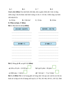 Câu 1. (0,5 điểm) Số gồm năm trăm triệu bảy trăm chín mươi nghìn, ba đơn vị viết là: A. 500 790 003 B. 500 709 003 C. 500 790 030 D. 500 709 030