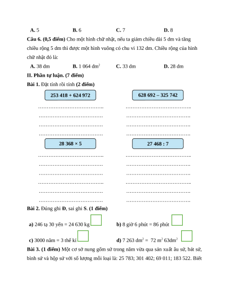 Bài 1. Đặt tính rồi tính (2 điểm) 253 418 + 624 972 628 692 – 325 742