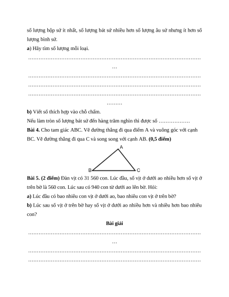 Bài 5. (2 điểm) Đàn vịt có 31 560 con. Lúc đầu, số vịt ở dưới ao nhiều hơn số vịt ở
