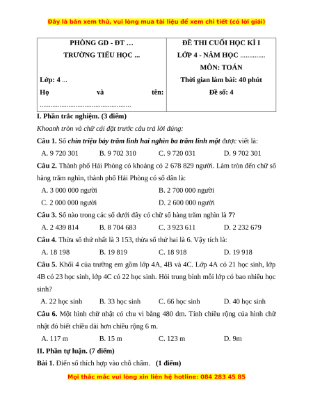 Đề thi cuối kì 1 Toán lớp 4 Kết nối tri thức - Đề 4