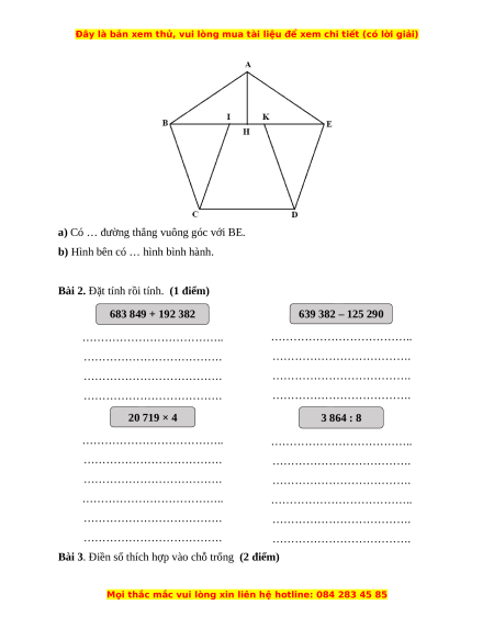 Bài 2. Đặt tính rồi tính. (1 điểm) 683 849 + 192 382 639 382 – 125 290