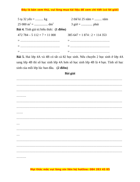 Bài 5. Hai lớp 4A và 4B có tất cả 82 học sinh. Nếu chuyển 2 học sinh ở lớp 4A